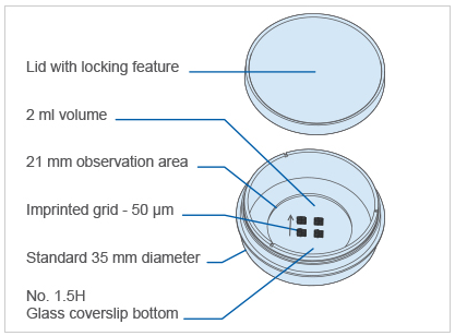 Introduction:A 35 mm imaging dish with a glass bottom and an imprinted 50 μm cell location grid Ideal for locating cells or cell clusters Easy cell counting per defined area Glass coverslip for TIRF and single molecule applications