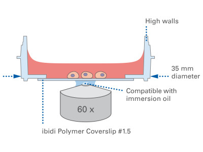 The μ-Dish 35 mm, high comes with a thin ibidi Polymer Coverslip Bottom that has the highest optical quality (comparable to glass) and is ideally suitable for high-resolution microscopy. It is also available with a #1.5H Glass Coverslip Bottom for TIRF or single molecule microscopy.