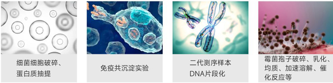 通過壓電轉(zhuǎn)換器,將電信號(hào)轉(zhuǎn)變?yōu)楦哳l聲波信號(hào),產(chǎn)生數(shù)百萬的分子“空穴”,利用“空穴”在幾秒內(nèi)變大、破裂產(chǎn)生的瞬時(shí)流體剪切力,通過等溫、非接觸的方式對(duì)樣本進(jìn)行打斷、勻漿和混合。