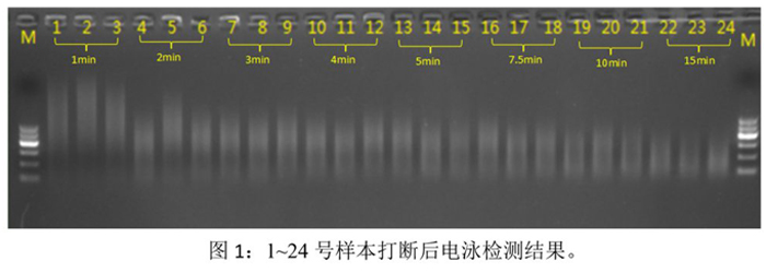 實(shí)驗(yàn)結(jié)果表明:(1) 隨著打斷時(shí)間的增加,打斷片段的大小也隨之變?。?2) 相同打斷條件下,打斷效果的重復(fù)性和均一性良好。